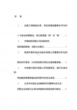 目录1.全国工商联副主席、奇安信集团董事长齐向东AI与安全双擎驱动,助力陕西逐“新”向“高”....12.齐鲁制药有限公司总裁李燕:创新基因铸魂,创新文化聚力....................33.陕西华秦科技实业股份有限公司董事长折生阳肩负时代使命,以科技创新引领企业高质量发展…...54.中信银行股份有限公司党委委员、副行长谢志斌:将金融资源精准输送至民营与科技主战场..........65.北京市长城企业战略研究所董事长武文生:民营企业创新已从单点突破转向系统深耕与联合....8在推进高水平科技自立自强中担当重任2025民营经济创新发展大会暨知名民企助力陕西高质量发展大会企业家发言...