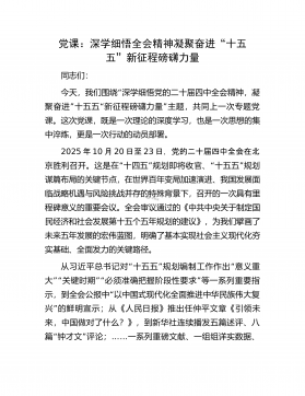 党课:深学细悟全会精神凝聚奋进“十五五”新征程磅礴力量同志们:“今天,我们围绕深学细悟党的二十届四中全会精神,凝”“”聚奋进十五五新征程磅礴力量主题,共同上一次专题党课。这次党课,既是一次理论的深度学习,也是一次思想的集中淬炼,更是一次行动的动员部署。2025年10月20日至23日,党的二十届四中全会在北“”“”京胜利召开。这是在十四五规划即将收官、十五五规划谋篇布局的关键节点,在世界百年变局加速演进、我国发展面临战略机遇与风险挑战并存的特殊背景下,召开的一次具有里程碑意义的重要会议。全会审议通过的《中共中央关于制定国民经济和社会发展第十五个五年规划的建议》,为我们擘画了未来五年发展的宏伟蓝图...