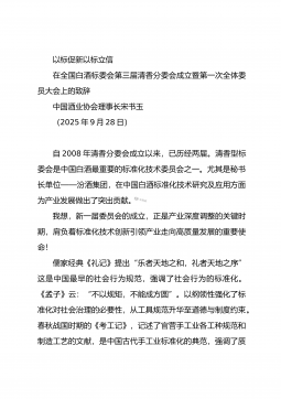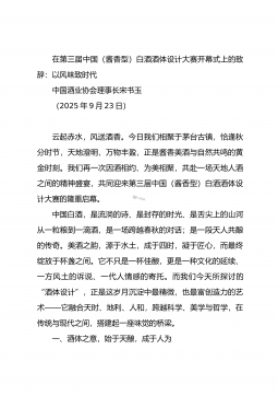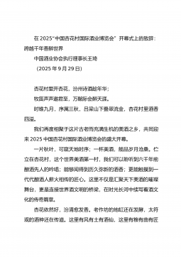 在2025“中国杏花村国际酒业博览会”开幕式上的致辞:跨越千年香醉世界中国酒业协会执行理事长王琦(2025年9月29日)杏花村里开杏花,汾州诗酒趁年华;牧笛声声邀君至,万酩际会醉天涯。时维九月,序属三秋,吕梁山下叠翠流金,杏花村里酒香四溢。我们再度相聚于这片古老而充满生机的美酒之乡,共同迎来2025中国杏花村国际酒业博览会的盛大开幕。一片秋叶,可窥天地时序;一杯美酒,能品岁月沧桑。伫立在杏花村,这个世界美酒第一村,我们可以聆听到六千年前酿酒先人的吟唱;能够闻得到历久弥新的酒香;更能触摸到一代代酿酒人薪火相传的匠心。这里不仅是汇聚天下美酒的璀璨舞台,更是连接世界酒文明的桥梁,在时光长河中续写着酒...