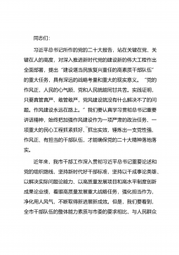 同志们:习近平总书记所作的党的二十大报告,站在关键在党、关键在人的高度,对深入推进新时代党的建设新的伟大工程作出全面部署,提出“建设堪当民族复兴重任的高素质干部队伍”的重大任务,具有深远的战略考量和重大的现实意义。“党的作风正,人民的心气顺,党和人民就能同甘共苦。实践证明,只要真管真严、敢管敢严,党风建设就没有什么解决不了的问题。作风建设永远在路上。”我们要认真学习贯彻总书记重要讲话精神,始终把加强作风建设作为一项严肃的政治任务、一项重大的民心工程抓紧抓好、抓出实效,锤炼出一支党性强、作风正、有担当的干部队伍,才能确保党的二十大精神落地落实。近年来,我市干部工作深入贯彻习近平总书记重要论述和党...