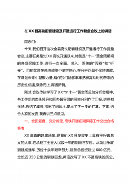 在XX县高铁配套建设及开通运行工作复盘会议上的讲话同志们:今天,我们召开这次全县高铁配套建设及开通运行工作复盘会议,主要任务是对XX高铁开通以来,“”特别是十一黄金周期间的各项保障工作,“”“进行一次全面、深入、系统的阅卷和析”卷。目的就是在总结成绩中坚定信心,在分析问题中保持清醒,在谋划未来中凝聚力量,确保我们能够牢牢把握高铁时代带来的历史性机遇,乘势而上,再谱新篇。刚才,会议传达学习了XX“”市十一黄金周总结分析会精神,各工作组的牵头领导和两办督导组的同志分别作了汇报,讲得都很好,总结了成绩,指出了问题,也提出了下一步的打算。下面,结合大家的发言,我再讲三点意见。一、全面复盘、充分肯定,高...