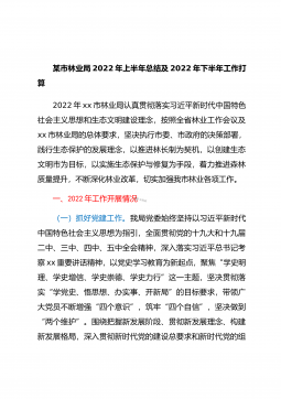某市林业局2022年上半年总结及2022年下半年工作打算2022年xx市林业局认真贯彻落实习近平新时代中国特色社会主义思想和生态文明建设理念,按照全省林业工作会议及xx市林业局的总体要求,坚决执行市委、市政府的决策部署,践行生态保护的发展理念,以推进林长制为契机,以创建生态文明市为目标,以实施生态保护与修复为手段,着力推进森林质量提升,不断深化林业改革,切实加强我市林业各项工作。一、2022年工作开展情况(一)抓好党建工作。我局党委始终坚持以习近平新时代中国特色社会主义思想为指引,全面贯彻党的十九大和十九届二中、三中、四中、五中全会精神,深入落实习近平总书记考察xx重要讲话精神,以党史学习教育...