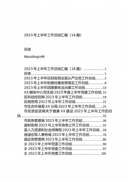 2023年上半年工作总结汇编(16篇)目录##paidbegin##2023年上半年工作总结汇编(16篇)........................1目录.....................................................................................12023年上半年区财政局全面从严治党工作总结..........32023年上半年税费优惠政策落实工作总结..................82023年上半年团旗委依法治旗工作总结....................10XX媒体中心党支部2023年度上半年党建工...