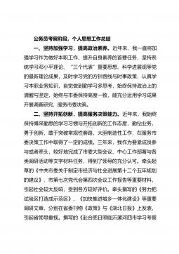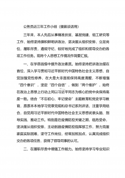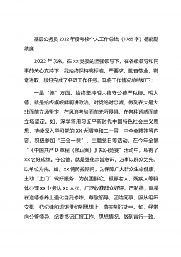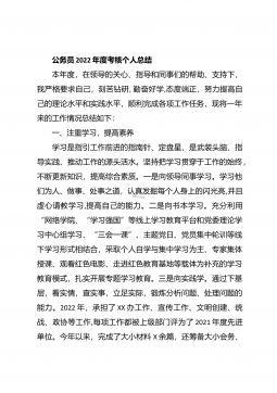 公务员2022年度考核个人总结本年度,在领导的关心、指导和同事们的帮助、支持下,我严格要求自己,刻苦钻研,勤奋好学,态度端正,努力提高自己的理论水平和实践水平,顺利完成各项工作任务,现将一年来的工作情况总结如下:一、注重学习,提高素养学习是指引工作前进的指南针、定盘星,是武装头脑、指导实践、推动工作的源头活水。坚持把学习贯穿于工作的始终,不断更新知识,提高综合素质。一是向领导同事学习。学习他们为人、做事、处事之道,认真发掘每个人身上的闪光亮,并且虚心请教学习,提高自己的能力。二是向书本学习。充分利用“网络学院、“学习强国”等线上学习教育平台和党委理论学习中心组学习、“三会一课”、主题党日、党员...
