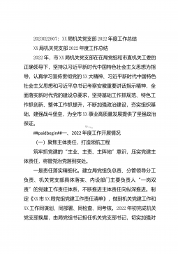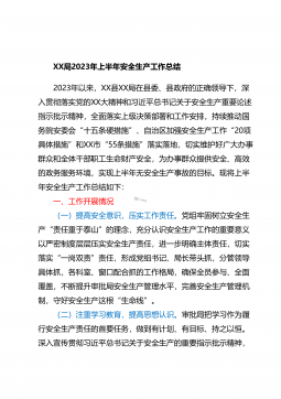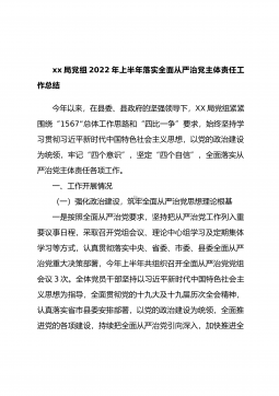 xx局党组2022年上半年落实全面从严治党主体责任工作总结今年以来,在县委、县政府的坚强领导下,XX局党组紧紧围绕“1567”总体工作思路和“四比一争”要求,始终坚持学习贯彻习近平新时代中国特色社会主义思想,以党的政治建设为统领,牢记“四个意识”,坚定“四个自信”,全面落实从严治党主体责任各项工作。一、工作开展情况(一)强化政治建设,筑牢全面从严治党思想理论根基一是按照全面从严治党要求,坚持把从严治党工作列入重要议事日程,采取召开党组会议、理论中心组学习及定期集体学习等方式,认真贯彻落实中央、省委、市委、县委全面从严治党重大决策部署,今年上半年共组织召开全面从严治党党组会议3次。全体党员干部坚...