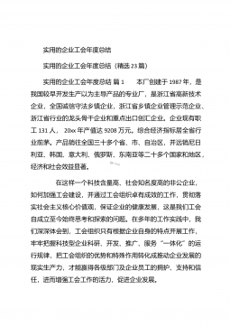 实用的企业工会年度总结实用的企业工会年度总结(精选23篇)实用的企业工会年度总结篇1 本厂创建于1987年,是我国较早开发生产以为主导产品的专业厂,是浙江省高新技术企业,全国诚信守法乡镇企业,浙江省乡镇企业管理示范企业、浙江省行业的龙头骨干企业和重点出口创汇企业。企业现有职工131人,20xx年产值达9208万元。综合经济指标居全省行业前茅。产品销往全国三十多个省、市、自治区,并远销尼日利亚、韩国、意大利、俄罗斯、东南亚等二十多个国家和地区,经济和社会效益显著。 在这样一个科技含量高、社会知名度高的非公企业,如何加强工会建设,并通过工会组织卓有成效的工作,贯彻落实社会主义核心价值观,保证企...