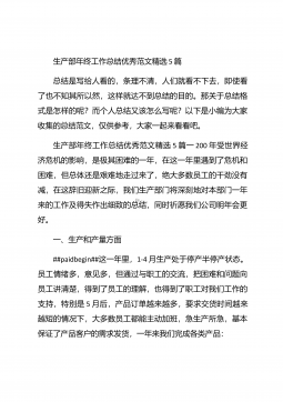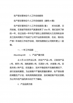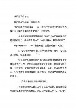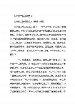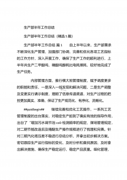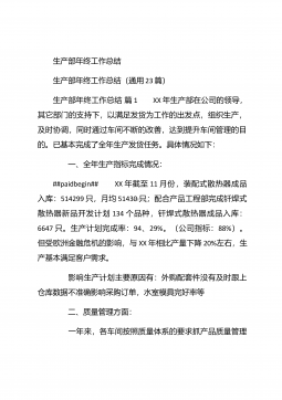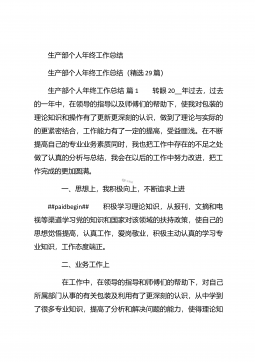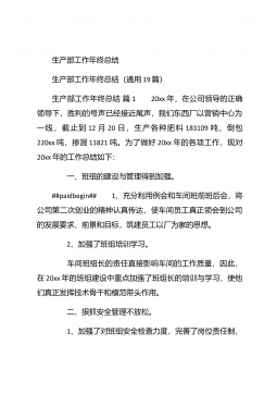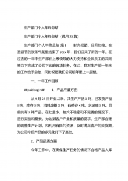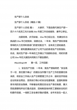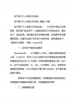 生产部门个人年度工作总结生产部门个人年度工作总结(精选27篇)生产部门个人年度工作总结篇1 XX年生产部在公司的领导,其它部门的支持下,以满足发货为工作的出发点,组织生产,及时协调,同时通过车间不断的改善,达到提升车间管理的目的。已基本完成了全年生产发货任务。具体情况如下:【更多公文素材,微信:dadawk01】 一、全年生产指标完成情况##paidbegin## XX年截至11月份,装配式散热器成品入库:514299只,月均51430只;配合产品工程部完成钎焊式散热器新品开发计划134个品种,钎焊式散热器成品入库:6647只。生产计划完成率:94、29%。(公司指标:88%)。但受欧洲...