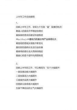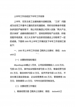 上半年工作总结及下半年工作安排上半年,在东北老工业基地振兴战略实施、“三农”问题成为全党工作重中之重的历史机遇面前,同时也在粮食市场复杂多变的严峻形势下,我公司在集团公司深入实施“两大产业、四大体系”战略构想的指引下,坚持发挥现有产业优势,积极挖掘市场资源,在三大主导产业及新项目建设上均取得了一定的成绩。下面将2005年上半年工作情况及下半年工作安排汇报如下:一、2005年上半年工作总结【更多公文素材,微信:dadawk01】(一)主要财务指标情况##paidbegin##截止5月末,公司实现销售收入2,010万元,亏损585万元,其中实业有限本部亏损32万元,粮食经营亏损391万元,复合材料...