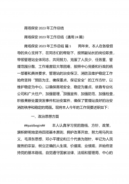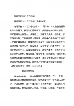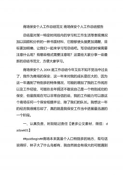 商场保安个人工作总结范文商场保安个人工作总结报告总结是对某一特定时间段内的学习和工作生活等表现情况加以回顾和分析的一种书面材料,它能够使头脑更加清醒,目标更加明确,让我们一起来学习写总结吧。写总结的时候需要注意什么呢?有哪些格式需要注意呢?这里给大家分享一些最新的总结书范文,方便大家学习。商场保安个人20XX底工作总结今年又在不知不觉当中过去了,我作为商场的保安,这一年来对我的成长是巨大的,因为这一年遇到了特别多的特殊情况,可能的增加了我的工作阅历以及工作经验,可能在去年我还不敢说自己是一个特别成功的保安,但是我现在可以非常自信的说,我的工作能力可以跟这个商场任何一个保安相提并论,除了我们的队...