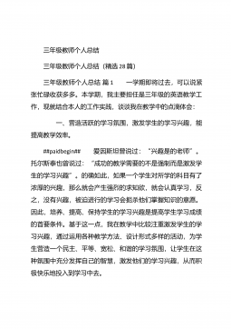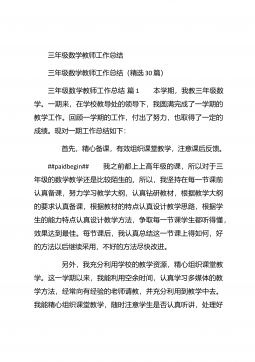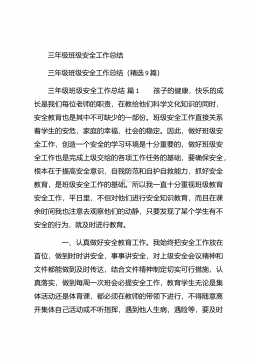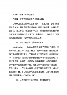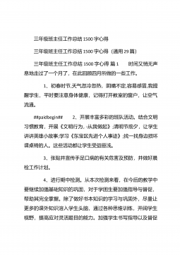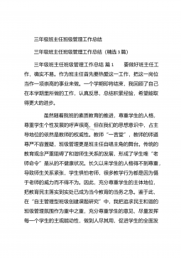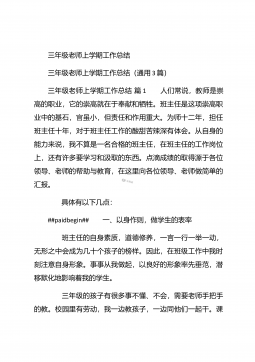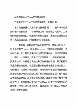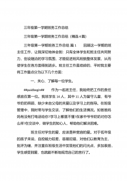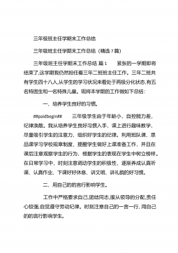 三年级班主任学期末工作总结三年级班主任学期末工作总结(精选7篇)三年级班主任学期末工作总结篇1 紧张的一学期即将结束了,这学期我仍然担任着三年二班班主任工作。三年二班共有学生四十八人,从学生的学习状况来看处于两极分化状态,有五名特困生和一名特殊儿童。现将本学期的工作做如下总结: 一、培养学生良好的习惯。##paidbegin## 三年级学生由于年龄小,自控能力差,纪律涣散。我从培养学生良好习惯入手,课上进行趣味教学,尽量吸引学生的注意力,组织好学生的纪律。利用班队课、思品课学习学校规章制度,提醒学生做好上课准备工作,并且在课后注意观察学生的行为,根据学生的表现在学生中树立榜样。在日常学习...