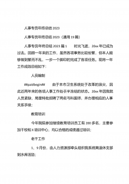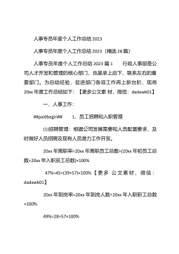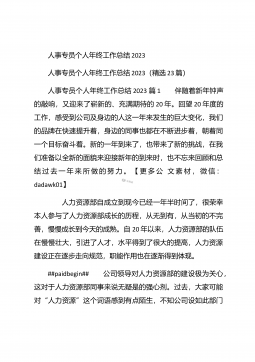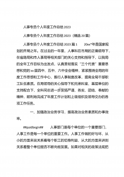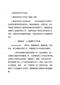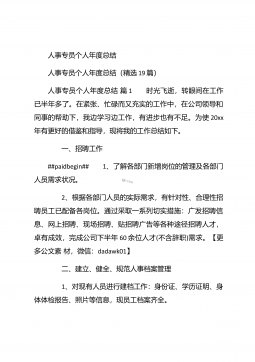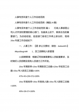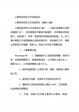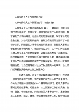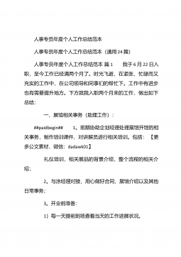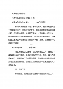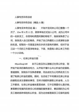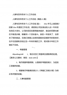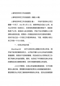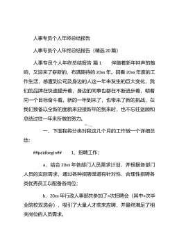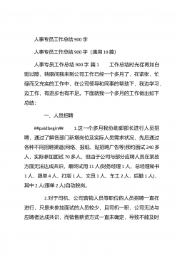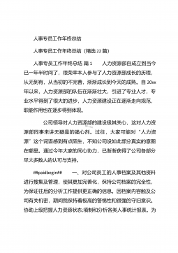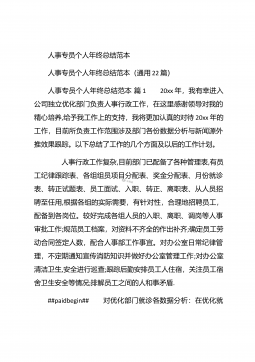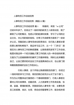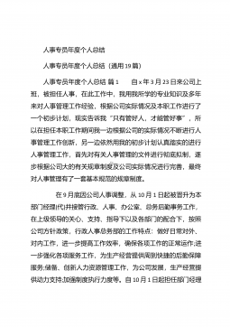 人事专员个人年终总结范本人事专员个人年终总结范本(通用22篇)人事专员个人年终总结范本篇1 20xx年,我有幸进入公司独立优化部门负责人事行政工作,在这里感谢领导对我的精心培养,给予我工作上的支持,我将更加认真的对待20xx年的工作,目前所负责工作范围涉及部门各份数据分析与新闻源外推效果跟踪。以下总结了工作的几个方面及以后的工作计划。 人事行政工作复杂,目前部门已配备了各种管理表,有员工纪律跟踪表、各组组员项目分配表、奖金分配表、月份就诊表、转正试题表、员工面试、入职、转正、离职表、从人员招聘至任用,根据各组的实际需要,有针对性,合理地招聘员工,配备到各岗位。较好完成各组人员的入职、离职、...
