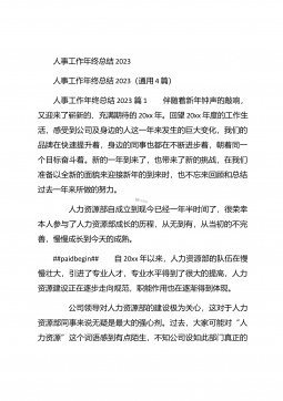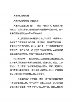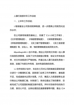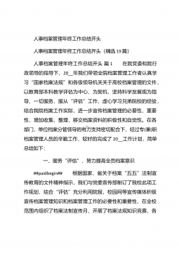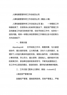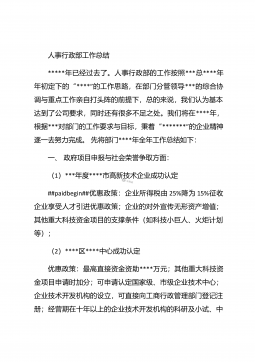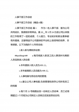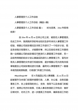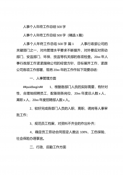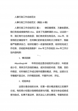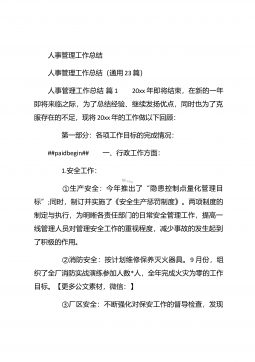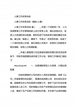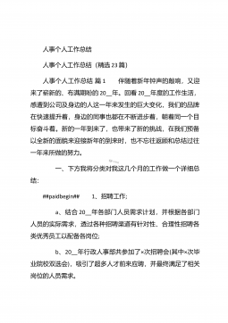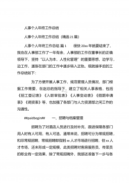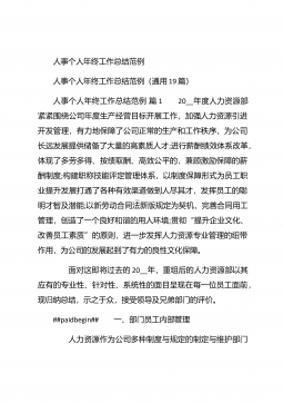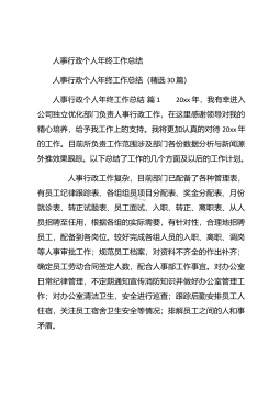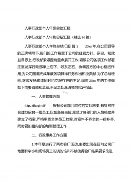 人事行政部个人年终总结汇报人事行政部个人年终总结汇报(精选26篇)人事行政部个人年终总结汇报篇1 20xx年,在公司领导的正确领导下,我们的工作着重于公司的经营方针、宗旨、和效益目标上,行政部紧紧围绕重点展开工作,紧跟公司各项工作部署.注重发挥行政部承上启下、联系左右、协调各方的中心枢纽作用,为公司圆满完成年度各项目标任务作出积极贡献.为了总结经验,继续发扬成绩同时也克服存在的不足,现将20xx年的工作做如下简要回顾和总结,不足之处恳请领导批评指正: 一、人事管理方面##paidbegin## 根据公司部门岗位的实际需要,有针对性合理地招聘一批员工,以配备各岗位.规范了各部门的人员档案并...