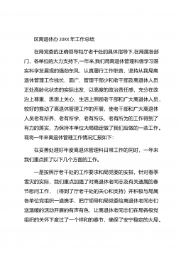 区离退休办20XX年工作总结在局党委的正确领导和厅老干处的具体指导下,在局属各部门、各单位的大力支持下,一年来,我们局离退休管理科借学习落实科学发展观的强劲东风,认真履行工作职责,坚持从我局离退休管理工作线长、面广、管理干部少和老干部及离退休人员正处高龄化状态的实际出发,以高度的政治责任感,充分在政治上尊重、思想上关心、生活上照顾老干部和广大离退休人员,较好的推动了离退休管理工作的开展,使老干部和广大离退休人员老有所养、老有所学、老有所乐、老有所为的工作得到了有力的落实,为保持本单位大局稳定做了我们应做的一些工作。现将一年来离退休管理工作情况汇报如下:在妥善处理好年度离退休管理科日常工作的同时...