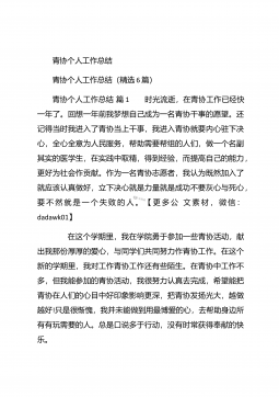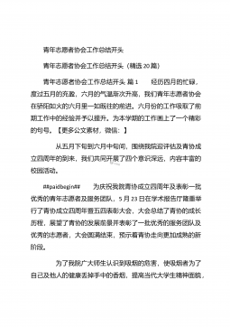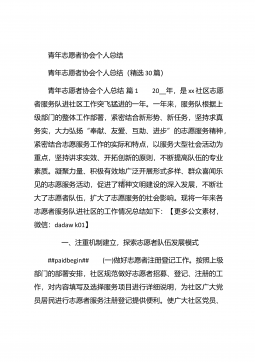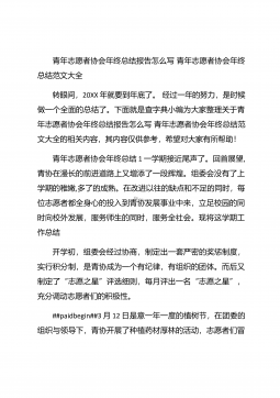 青年志愿者协会年终总结报告怎么写青年志愿者协会年终总结范文大全转眼间,20XX年就要到年底了。经过一年的努力,是时候做一个全面的总结了。下面就是查字典小编为大家整理关于青年志愿者协会年终总结报告怎么写青年志愿者协会年终总结范文大全的相关内容,其内容仅供参考,希望对大家有所帮助!青年志愿者协会年终总结1一学期接近尾声了。回首展望,青协在漫长的前进道路上又增添了一段辉煌。组委会没有了上学期的稚嫩,多了的成熟。在改进以往的缺点和不足的同时,每位志愿者都全身心的投入到青协发展事业中来,立足校园的同时向校外发展,服务师生的同时,服务全社会。现将这学期工作总结开学初,组委会经过协商,制定出一套严密的奖惩制...