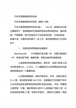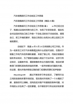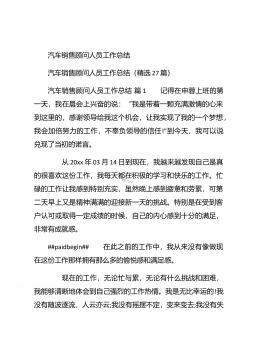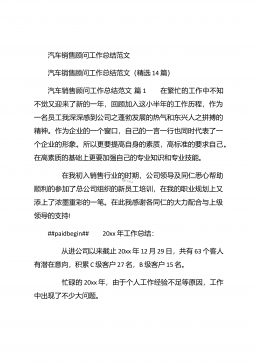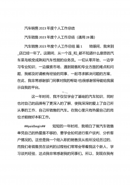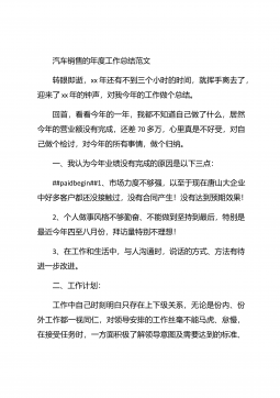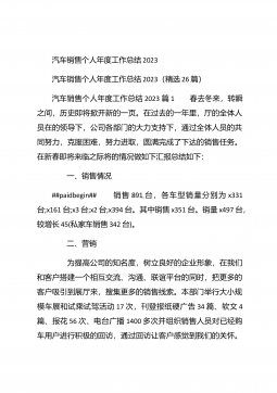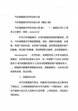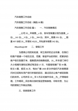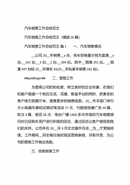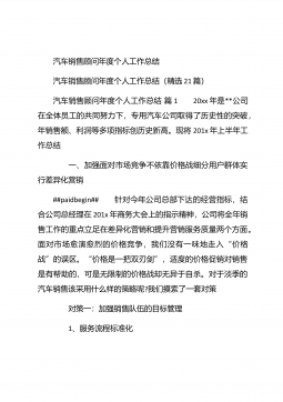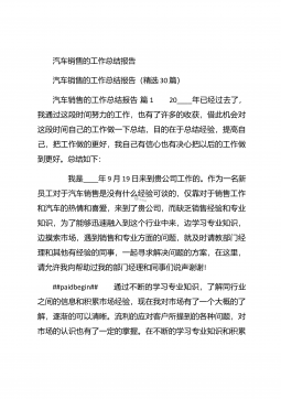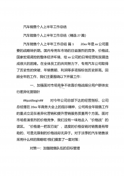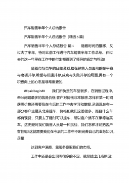 汽车销售半年个人总结报告汽车销售半年个人总结报告(精选5篇)汽车销售半年个人总结报告篇1 随着时间的推移,又过去了半年,特对此前工作进行汽车销售半年工作总结。在过去的这一年里在工作中的付出都得到了领导的肯定与帮助! 随着市场竞争的日益激烈,摆在销售人员面前的是平稳与磨砺并存,希望与机遇并存,成功与失败并存的局面,拥有一个积极向上的心态是非常重要的.##paidbegin## 我们所负责的车型很多,在销售过程中,牵涉问题最多的就是价格,客户对价格非常敏感,怎样在第一时间获悉价格还需要我在今后的工作中去学习和掌握.承德现在有一部分客户主要从北京提车,价格和我们这差很多,而且什么车都有现货,只...