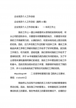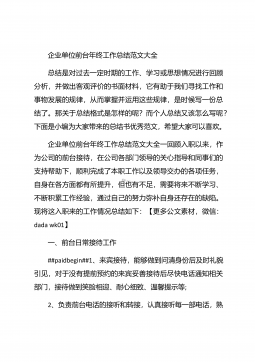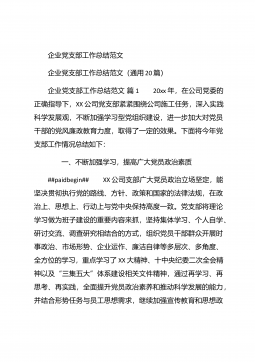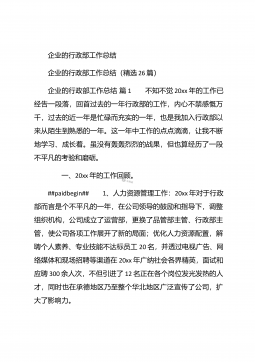 企业的行政部工作总结企业的行政部工作总结(精选26篇)企业的行政部工作总结篇1 不知不觉20xx年的工作已经告一段落,回首过去的一年行政部的工作,内心不禁感慨万千,过去的近一年是忙碌而充实的一年,也是我加入行政部以来从陌生到熟悉的一年。这一年中工作的点点滴滴,让我不断地学习、成长着。虽没有轰轰烈烈的战果,但也算经历了一段不平凡的考验和磨砺。 一、20xx年的工作回顾。##paidbegin## 1、人力资源管理工作:20xx年对于行政部而言是个不平凡的一年,在公司领导的鼓励和指导下,调整组织机构,公司成立了运营部,更换了品管部主管、行政部主管,使公司各项工作展开了新的局面;优化人力资源配...