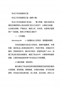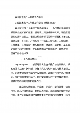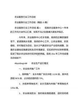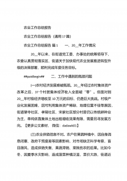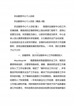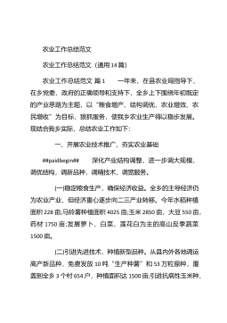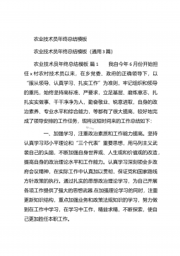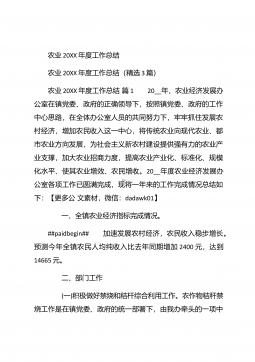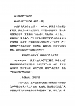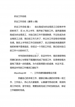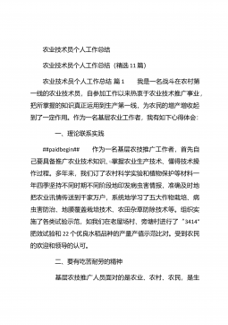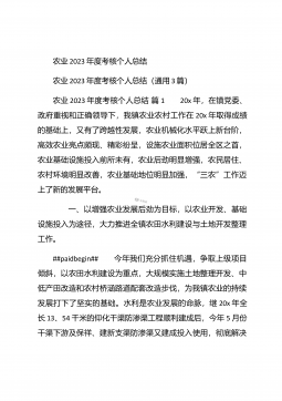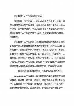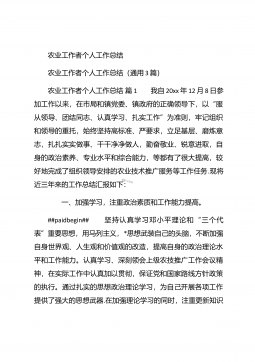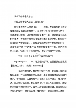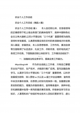 农业个人工作总结农业个人工作总结(精选3篇)农业个人工作总结篇1 本人自任职以来,在各级领导的正确领导下和上级业务部门的具体指导下,高举中国特色社会主义伟大旗帜,以邓小平理论和“三个代表”重要思想为指导,坚持科学发展观,认真贯彻落实党在农村的各项路线方针政策,深入基层,求真务实,本人在思想修养、工作作风、廉洁自律等方面取得了长足进步,扎实工作,尽职尽责,较好地完成了各项工作任务。下面我就任职以来的学习、工作情况总结如下: 一、加强政治和业务学习,提高业务工作能力。##paidbegin## 作为农业战线上工作者,只有自己掌握农业生产知识、生产技术,才能进行推广应用。首先加强自身学习。认真...