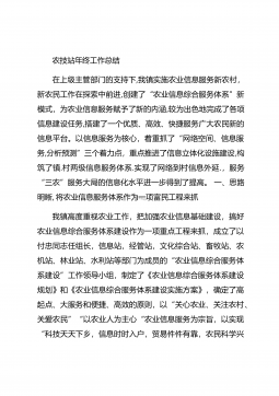 农技站年终工作总结在上级主管部门的支持下,我镇实施农业信息服务新农村,新农民工作在探索中前进,创建了“农业信息综合服务体系”新模式,为农业信息服务赋予了新的内涵,较为出色地完成了各项信息建设任务,搭建了一个优质、高效、快捷服务广大农民新的信息平台。以信息服务为核心,着重抓了“网络空间、信息服务,分析预测”三个着力点,重点推进了信息立体化设施建设,构筑了镇.村两级信息服务体系.实现了网络到村信息外延.,服务“三农”服务大局的信息化水平进一步得到了提高。一、思路明晰,将农业信息服务体系作为一项富民工程来抓我镇高度重视农业工作,把加强农业信息基础建设,搞好农业信息综合服务体系建设作为一项重点工程来抓...