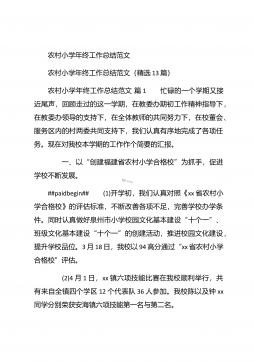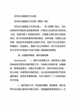 农村幼儿园园务工作总结农村幼儿园园务工作总结(精选27篇)农村幼儿园园务工作总结篇1 新《纲要》指出:充分利用自然环境和社区的教育资源,扩展幼儿生活和学习的空间。为此,我园开展了利用废旧材料,开展美工操作活动的特色研究。孩子们利用收集来的废旧物品,动手动脑,布置幼儿园环境,创造出许多别具匠心的美工作品,培养了幼儿动手能力、审美能力、创造能力,增强了幼儿环保意识。孩子们在欣赏中学习,在学习中再创作,形成了我园一道亮丽的风景线。 四、加强规范管理,做好后勤保障##paidbegin## 1、做好卫生保健工作。做好新生入园前的体检和日常流行病的预防工作,对体弱儿特别护理,加强锻炼,提高免疫能力...