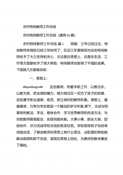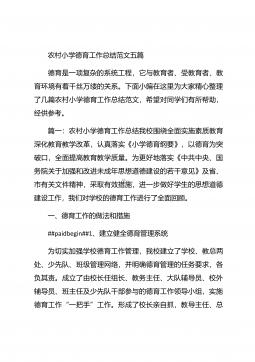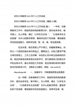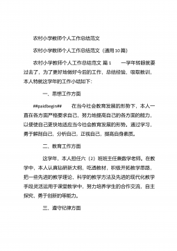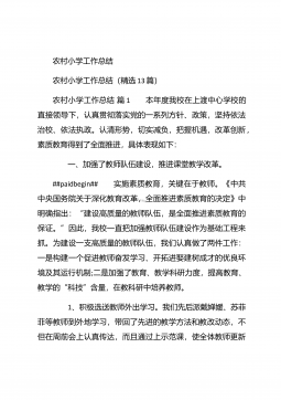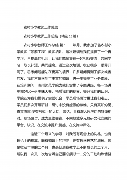 农村小学教师工作总结农村小学教师工作总结(精选15篇)农村小学教师工作总结篇1 年月,我参加了省农村小学教师“领雁工程”教师培训。这次培训给我们提供了一个再学习、再提高的机会,让我们能聚集在一起相互交流,共同学习,取长补短,共同提高。通过这次培训,收获很多,眼界开阔了,思考问题能站在更高的境界,许多疑问得到了解决或者启发。我们不仅学到了丰富的知识,进一步提高了业务素质。在培训期间,湖州师范学院为我们安排了专题讲座,每一场讲座都好比一份美味大餐,拓展我们的视界,提升我们的认识。学院还为我们提供了实践机会,学员现场研讨更让我们难忘。学员们多次开展研讨,研讨中没有虚假的恭维,只有真知灼见、真实流露...