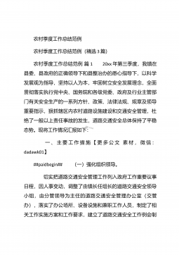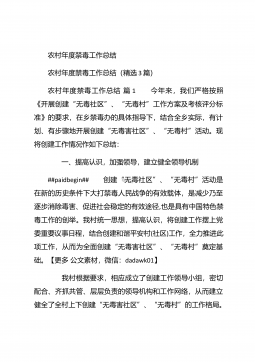 农村年度禁毒工作总结农村年度禁毒工作总结(精选3篇)农村年度禁毒工作总结篇1 今年来,我们严格按照《开展创建“无毒社区”、“无毒村”工作方案及考核评分标准》的要求,在乡禁毒办的具体指导下,结合全乡实际,有计划、有步骤地开展创建“无毒害社区”、“无毒村”活动。现将创建工作情况作如下总结: 一、提高认识,加强领导,建立健全领导机制##paidbegin## 创建“无毒社区”、“无毒村”活动是在新的历史条件下大打禁毒人民战争的有效载体,是减少乃至逐步消除毒害、促进社会稳定的有效途径,也是具有中国特色禁毒工作的创举。我村统一思想,提高认识,将创建工作摆上党委重要议事日程,结合创建和谐平安村(社区...