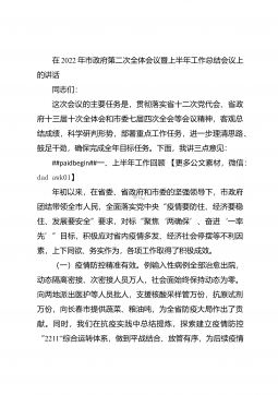 在2022年市政府第二次全体会议暨上半年工作总结会议上的讲话同志们:这次会议的主要任务是,贯彻落实省十二次党代会、省政府十三届十次全体会和市委七届四次全会等会议精神,客观总结成绩,科学研判形势,部署重点工作任务,进一步理清思路、鼓足干劲,确保完成全年目标任务。下面,我讲三点意见:##paidbegin##一、上半年工作回顾【更多公文素材,微信:dadawk01】年初以来,在省委、省政府和市委的坚强领导下,市政府团结带领全市人民,全面落实党中央“疫情要防住、经济要稳住、发展要安全”要求,对标“聚焦‘两确保’、奋进‘一率先’”目标,积极应对省内疫情多发、经济社会停摆等不利因素,上下同欲、务实作为,...
