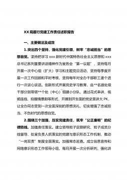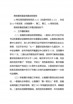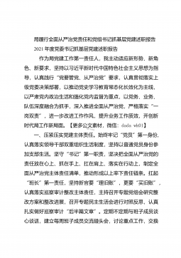 局履行全面从严治党责任和党组书记抓基层党建述职报告2021年度党委书记抓基层党建述职报告 作为局党建工作第一责任人,我主动适应新形势、新角色、新要求,坚持以习近平新时代中国特色社会主义思想为指导,认真践行“党要管党、从严治党”要求,认真贯彻落实上级党委决策部署,以推动党史学习教育常态化长效化为主线,以严肃党内政治生活和强化党内监督为重点,以党务、业务、队伍深度融合为抓手,深入推进全面从严治党,严格落实“一岗双责”,进一步改进工作作风,提升业务工作质效,开创新时代局工作新局面。【更多公文素材,微信:dadawk01】一、压紧压实党建主体责任。始终牢记“党员”第一身份,认真落实领导干部双重组...