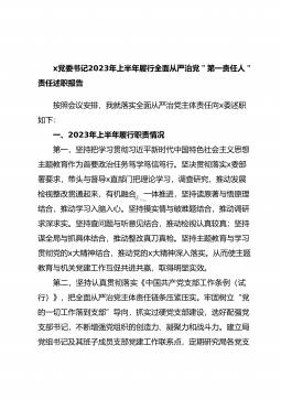 x党委书记2023年上半年履行全面从严治党"第一责任人"责任述职报告按照会议安排,我就落实全面从严治党主体责任向x委述职如下:一、2023年上半年履行职责情况第一,坚持把学习贯彻习近平新时代中国特色社会主义思想主题教育作为首要政治任务笃学笃信笃行。坚决贯彻落实x委部署要求,带头与督导x直部门把理论学习,调查研究,推动发展检视整改贯通起来,有机融合,一体推进,坚持读原著与悟原理结合,推动学习入脑入心。坚持摸实情与破难题结合,推动调研求深求实。坚持查问题与听意见结合,推动检视认真较真;坚持谋全局与抓具体结合,推动整改真刀真枪。坚持主题教育与学习贯彻党的x大精神结合,推动党的x大精神深入落实。从而使...