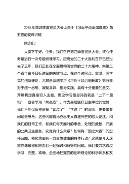 2025年第四季度党员大会上关于《习近平谈治国理政》第五卷的党课讲稿同志们:大家下午好。今天,我们召开第四季度党员大会,核心任务是进行一次专题党课学习。距离党的二十大胜利召开已经过去了三年,我们正处在全面贯彻落实党的二十大精神、向第二个百年奋斗目标进军的关键节点。在这个时间点,重温、深学党的创新理论,尤其是系统学习《习近平谈治国理政》第五卷,对于统一思想、凝聚共识、指导实践,具有十分重要的意义。开篇我想直接切入主题。理论学习最忌讳的就是“上下一般粗”,或者学用“两张皮”。作为基层医疗卫生单位的党员,我们不能仅仅停留在“读过了”“学过了”的层面,更要带着问题去思考:这些闪耀着马克思主义真理光芒的...