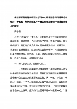 组织部常务副部长在理论学习中心组专题学习习近平总书记对“十五五”规划编制工作作出的重要指示精神研讨交流会上的发言同志们:习近平总书记对“十五五”规划编制工作作出的重要指示高屋建瓴、内涵丰富,为我们指明了方向、提供了遵循。作为组织部门,我们肩负着为党和人民事业选贤任能、强基固本、育才聚才的重要使命,必须深刻领会指示精神,将其贯穿到组织工作的全过程、各方面。下面,结合近期学习思考和工作实际,我谈几点体会,以供同志们参考。一、深化思想认识,把握核心要义(一)深刻认识科学制定和接续实施五年规划的重大意义科学制定和接续实施五年规划,是我们党治国理政的重要经验,是中国特色社会主义的重要政治优势。从“一五”...