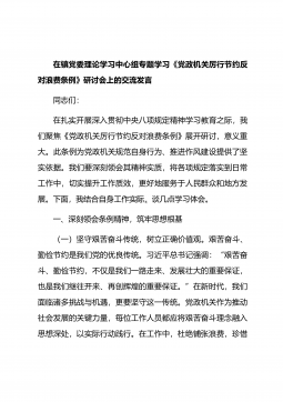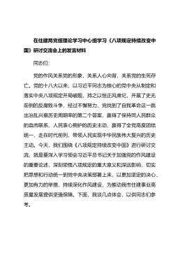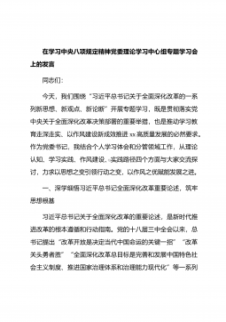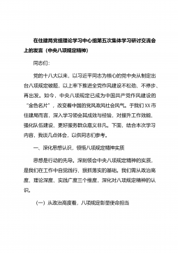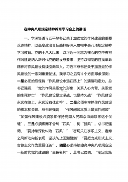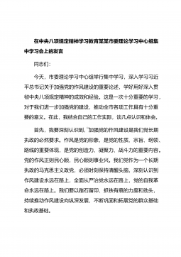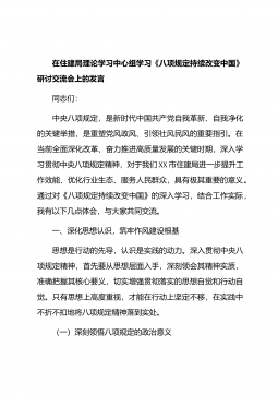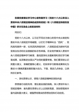 在镇党委理论学习中心组专题学习《党的十八大以来深入贯彻中央八项规定精神的成效和经验》和《八项规定持续改变中国》研讨交流会上的发言材料同志们:党的十八大以来,以习近平同志为核心的党中央从制定和落实中央八项规定开局破题,以钉钉子精神纠治“四风”,党风政风焕然一新,社风民风持续向好,八项规定成为新时代改变政治生态和社会面貌的标志性举措。在全党开展深入贯彻中央八项规定精神学习教育,是巩固深化主题教育和党纪学习教育成果、纵深推进全面从严治党的重要举措。我们要深刻认识其重大意义,准确把握核心要义,切实将学习教育成果转化为推动XX镇高质量发展的强大动力。下面,我谈几点体会,以供同志们参考。一、深化思想认识,...