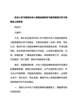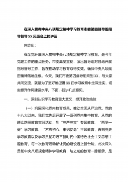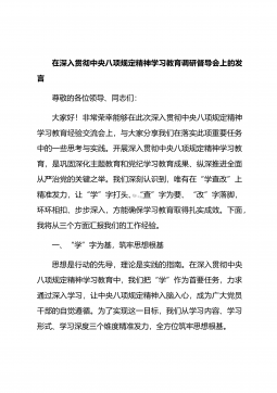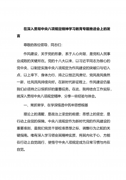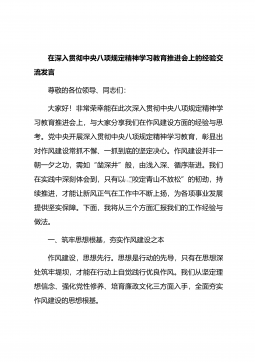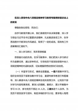 在审计局党组理论学习中心组专题学习《党的十八大以来深入贯彻中央八项规定精神的成效和经验》和《八项规定持续改变中国》研讨交流会上的发言同志们:党的十八大以来,以习近平同志为核心的党中央从制定和落实中央八项规定开局破题,持之以恒正风肃纪,以钉钉子精神纠“四风”、树新风,党风政风为之一新,社风民风持续向好。通过学习《党的十八大以来深入贯彻中央八项规定精神的成效和经验》和《八项规定持续改变中国》,我深感作风建设的重要性和紧迫性。作为XX市审计局党组的一员,我们必须深刻认识中央八项规定精神的重大意义,将其贯彻到审计工作的全过程,以优良的作风推动审计事业高质量发展。下面,我结合近期学习情况,谈几点体会,以...