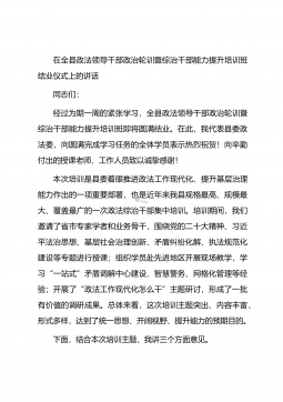 在全县政法领导干部政治轮训暨综治干部能力提升培训班结业仪式上的讲话同志们:经过为期一周的紧张学习,全县政法领导干部政治轮训暨综治干部能力提升培训班即将圆满结业。在此,我代表县委政法委,向圆满完成学习任务的全体学员表示热烈祝贺!向辛勤付出的授课老师、工作人员致以诚挚感谢!本次培训是县委着眼推进政法工作现代化、提升基层治理能力作出的一项重要部署,也是近年来我县规格最高、规模最大、覆盖最广的一次政法综治干部集中培训。培训期间,我们邀请了省市专家学者和业务骨干,围绕党的二十大精神、习近平法治思想、基层社会治理创新、矛盾纠纷化解、执法规范化建设等专题进行授课;组织学员赴先进地区开展现场教学,学习“一站式...