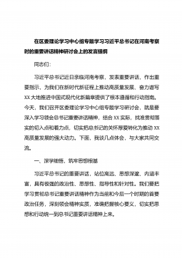 在区委理论学习中心组专题学习习近平总书记在河南考察时的重要讲话精神研讨会上的发言提纲同志们:习近平总书记近日亲临河南考察,发表重要讲话,作出重要指示,为我们在新时代新征程上推动高质量发展、奋力谱写XX大地推进中国式现代化新篇章提供了根本遵循和行动指南。今天,我们召开区委理论学习中心组专题学习研讨会,就是要深入学习领会总书记重要讲话精神,结合XX实际,找准贯彻落实的切入点和着力点,切实把总书记的关怀厚爱转化为推动XX高质量发展的强大动力。下面,我谈几点体会,与大家共同交流。一、深学细悟,筑牢思想根基习近平总书记的重要讲话,站位高远、思想深邃、内涵丰富,具有极强的政治性、思想性、指导性和针对性。我...