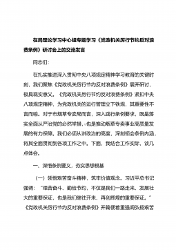 在局理论学习中心组专题学习《党政机关厉行节约反对浪费条例》研讨会上的交流发言同志们:在扎实推进深入贯彻中央八项规定精神学习教育的关键时刻,我们聚焦《党政机关厉行节约反对浪费条例》展开研讨,极具现实意义。《党政机关厉行节约反对浪费条例》紧扣中央八项规定精神,为党政机关的运行管理立下铁规,其重要性不言而喻。对于市烟草专卖局而言,深入践行条例要求,既是落实全面从严治党的必然举措,也是推动烟草专卖事业高质量发展的有力保障。我们必须从讲政治的高度,深刻领会条例内涵,将其全面贯彻到各项工作之中。下面,我结合工作实际,谈几点体会。一、深悟条例要义,夯实思想根基(一)领悟艰苦奋斗精神,筑牢价值观念。习近平总书...