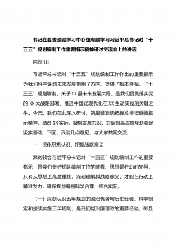 书记在县委理论学习中心组专题学习习近平总书记对“十五五”规划编制工作重要指示精神研讨交流会上的讲话同志们:习近平总书记对“十五五”规划编制工作作出的重要指示为我们科学谋划未来发展指明了方向、提供了根本遵循。“十五五”规划编制,关乎XX县未来发展大局,是我们贯彻落实党的XX大战略部署、推进中国式现代化在XX生动实践的关键之举。今天,我们在此深入研讨,就是要准确把握总书记重要指示精神,结合XX实际,凝聚发展共识,为编制高质量规划奠定坚实基础。下面,我谈几点意见,与大家共同交流。一、深化思想认识,把握战略意义深刻领会习近平总书记对“十五五”规划编制工作的重要指示,是我们做好规划编制工作的前提。思想是...