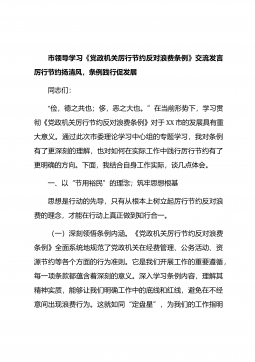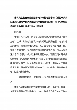 市人大主任在市委理论学习中心组专题学习《党的十八大以来深入贯彻中央八项规定精神的成效和经验》和《八项规定持续改变中国》研讨交流会上的发言同志们:党的十八大以来,以习近平同志为核心的党中央以“徙木立信”之举,从制定和落实中央八项规定开局破题,持之以恒正风肃纪,党风政风社风为之一新,党心军心民心为之一振。在深入开展贯彻中央八项规定精神学习教育之际,市人大党组深入学习《党的十八大以来深入贯彻中央八项规定精神的成效和经验》《八项规定持续改变中国》,对于我们深刻领悟作风建设的重大意义,以优良作风履行人大职责、推动人大工作高质量发展,具有极为重要的现实意义。借此机会,我谈几点体会,以供同志们参考。一、提高...