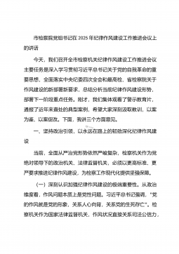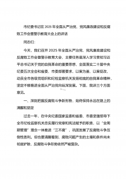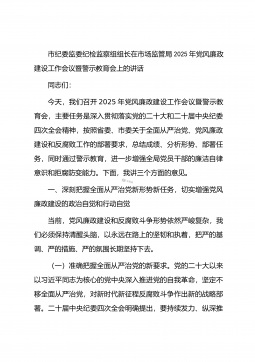 市纪委监委纪检监察组组长在市场监管局2025年党风廉政建设工作会议暨警示教育会上的讲话同志们:今天,我们召开2025年党风廉政建设工作会议暨警示教育会,主要任务是深入贯彻落实党的二十大和二十届中央纪委四次全会精神,按照省委、市委关于全面从严治党、党风廉政建设和反腐败工作的部署要求,总结成绩、分析形势、部署任务,同时通过警示教育,进一步增强全局党员干部的廉洁自律意识和拒腐防变能力。下面,我讲三个方面的意见。一、深刻把握全面从严治党新形势新任务,切实增强党风廉政建设的政治自觉和行动自觉当前,党风廉政建设和反腐败斗争形势依然严峻复杂,我们必须保持清醒头脑,以永远在路上的坚韧和执着,把严的基调、严的措...