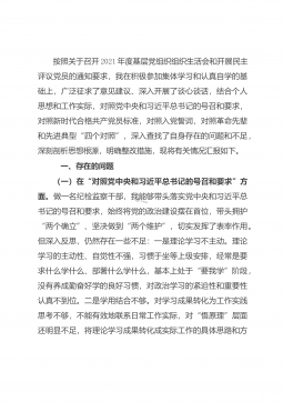 按照关于召开2021年度基层党组织组织生活会和开展民主评议党员的通知要求,我在积极参加集体学习和认真自学的基础上,广泛征求了意见建议、深入开展了谈心谈话,结合个人思想和工作实际,对照党中央和习近平总书记的号召和要求,对照新时代合格共产党员标准,对照入党誓词,对照革命先辈和先进典型“四个对照”,深入查找了自身存在的问题和不足,深刻剖析思想根源,明确整改措施,现将有关情况汇报如下。 一、存在的问题(一)在“对照党中央和习近平总书记的号召和要求”方面。做一名纪检监察干部,我能够带头落实党中央和习近平总书记的号召和要求,始终将党的政治建设摆在首位,带头拥护“两个确立”、坚决做到“两个维护”,切实发挥了...