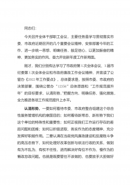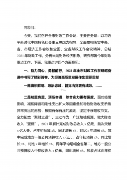 同志们:今天,我们召开全市财政工作会议,主要任务是:以习近平新时代中国特色社会主义思想为指导,全面贯彻落实中央、省、市经济工作会议和全国、全省财政工作会议精神,总结2021年财政工作,分析当前财政经济形势,研究部署今年财政重点工作。下面,我重点讲四个方面意见:一、勠力同心、勇毅前行,2021年全市财政工作在砥砺奋进中书写了精彩答卷,为经济高质量发展作出重要贡献一是旗帜鲜明、政治忠诚,管党治党更有成效。……二是知重负重、顶压奋进,综合实力更有强度。面对疫情影响、减税降费和刚性支出扩大等因素叠加导致财政收支矛盾异常突出的形势,按照有保有压的原则,坚定不移增收节支。全力拓宽“聚财之道”。主动作为,广...