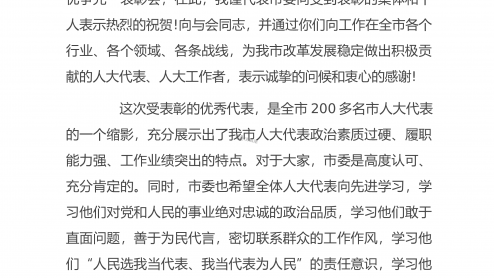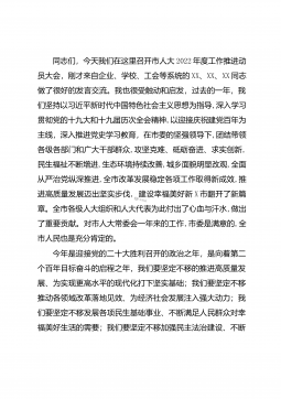 同志们,今天我们在这里召开市人大2022年度工作推进动员大会,刚才来自企业、学校、工会等系统的XX、XX、XX同志做了很好的发言交流。我也很受触动和启发,过去的一年,我们坚持以习近平新时代中国特色社会主义思想为指导,深入学习贯彻党的十九大和十九届历次全会精神,以迎接庆祝建党百年为主线,深入推进党史学习教育,在市委的坚强领导下,团结带领各级各部门和广大干部群众,攻坚克难、砥砺奋进、求实创新,民生福祉不断增进,生态环境持续改善,城乡面貌明显改观,全面从严治党纵深推进,全市改革发展稳定各项工作取得新成效,推进高质量发展迈出坚实步伐,建设幸福美好新X市翻开了新篇章。全市各级人大组织和人大代表为此付出了...