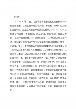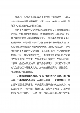 同志们,今天的党建会议的主题围绕“运用党的十九届六中全会精神来指导集团发展”为重点内容,关于这个主题,我有以下几点感悟与大家进行交流。党的十九届六中全会全面总结党的百年奋斗重大成就和历史经验,对推动全党更加坚定、更加自觉地践行初心使命,在新时代夺取新的伟大胜利具有深远意义。习近平总书记在全会上的重要讲话,深刻回答了新时代党和国家事业发展的重大理论和实践问题,为我们提供了强大思想武器、指明了前进方向。学习贯彻党的十九届六中全会精神,是当前和今后一个时期的重要的政治任务。各级党委支部书记,要带领各级党组织和广大党员在学深悟透上下功夫,在融会贯通上求实效,在学以致用上作表率,撸起袖子加油干、扑下身子...