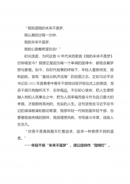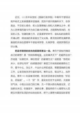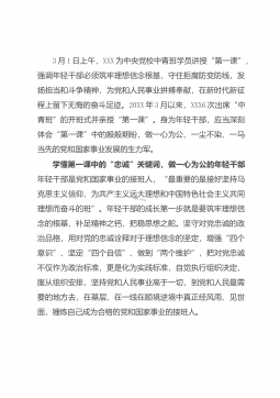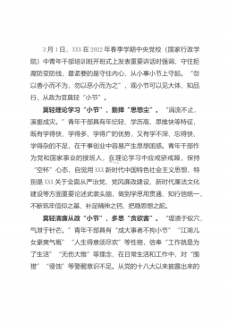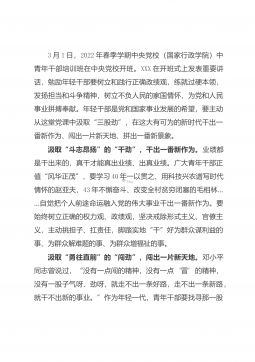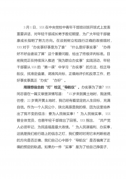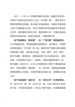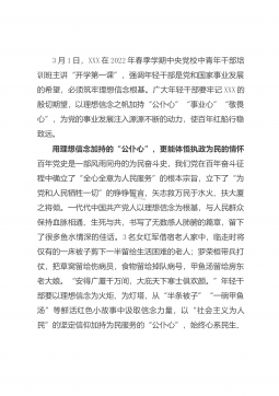 3月1日,XXX在2022年春季学期中央党校中青年干部培训班主讲“开学第一课”,强调年轻干部是党和国家事业发展的希望,必须筑牢理想信念根基。广大年轻干部要牢记XXX的殷切期望,以理想信念之帆加持“公仆心”“事业心”“敬畏心”,为党的事业发展注入源源不断的动力,使百年红船行稳致远。用理想信念加持的“公仆心”,更能体悟执政为民的情怀百年党史是一部风雨同舟的为民奋斗史,我们党在百年奋斗征程中确立了“全心全意为人民服务”的根本宗旨,立下了“为党和人民牺牲一切”的铮铮誓言,矢志救万民于水火、扶大厦之将倾。一代代中国共产党人以理想信念为根基,与人民群众保持血脉相通、生死与共,书写了无数感人肺腑的篇章,留下...
