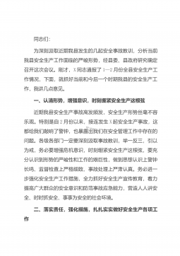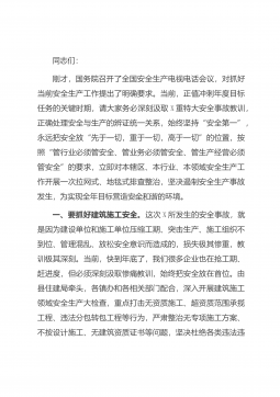 同志们:刚才,国务院召开了全国安全生产电视电话会议,对抓好当前安全生产工作提出了明确要求。当前,正值冲刺年度目标任务的关键时期,请大家务必深刻汲取X重特大安全事故教训,正确处理安全与生产的辨证统一关系,始终坚持“安全第一”,永远把安全放“先于一切,重于一切,高于一切”的位置,按照“管行业必须管安全、管业务必须管安全、管生产经营必须管安全”的要求,立即对本辖区、本行业、本领域安全生产工作开展一次拉网式、地毯式排查整治,坚决遏制安全生产事故发生,为实现全年目标营造安全和谐的环境。一、要抓好建筑施工安全。这次X所发生的安全事故,就是因为建设单位和施工单位压缩工期、突击生产、施工组织不到位、管理混乱、...