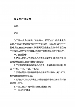 安全生产协议书甲方:乙方:为了进一步贯彻落实“安全第一、预防为主”的安全生产方针,严格执行劳动保护和安全生产的法令、法规,强化安全生产管理,落实安全生产责任制,依法从严治理施工现场,确保项目施工中操作人员的安全与健康,促进施工顺利进行,特签订本协议。一、安全管理:1.乙方人员进入工作现场必须正确佩戴安全帽,临边作业时正确佩戴安全带,安全带要有可靠拉结;2.工作现场所使用的电源必须符合一级漏电两级保护制,保证“一机、一闸、一漏、一配电;3.现场内的安全隐患整改率必须保证在时限内达到100%,杜绝现场重大隐患的出现;4.现场内不发生火灾事故,火险隐患整改率必须保证在时限内达到100%;5.不发生重...