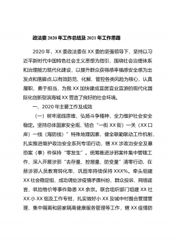 政法委2020年工作总结及2021年工作思路2020年,XX委政法委在XX委的坚强领导下,坚持以习近平新时代中国特色社会主义思想为指引,围绕社会治理体系和治理能力现代化建设,以提升群众获得感幸福感安全感为出发点和落脚点,以有效防范、化解、管控各类风险为核心,认真履职、勇于担当,为我XX加快建成宜居宜业宜游的现代化国际化创新型滨海城XX营造了良好的社会环境。一、2020年主要工作及成效(一)树牢底线思维,弘扬斗争精神,全力维护社会安全稳定。坚持总体国家安全观,结合“一街XX街)一关(XX口岸)一线(海防线)”特殊地理因素,健全联勤联动工作机制,扎实推进维护政治安全系列专项行动,辖XX涉政治安全及...