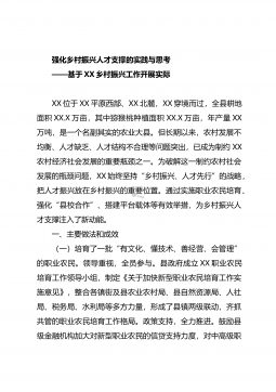 强化乡村振兴人才支撑的实践与思考——基于XX乡村振兴工作开展实际XX位于XX平原西部、XX北麓,XX穿境而过,全县耕地面积XX.X万亩,其中猕猴桃种植面积XX.X万亩,年产量XX万吨,是一个名副其实的农业大县。但长期以来,农村发展不均衡、人才缺乏、人才结构不合理等问题突出,已成为制约XX农村经济社会发展的重要瓶颈之一。为破解这一制约农村社会发展的瓶颈问题,XX始终坚持“乡村振兴、人才先行”的战略,把人才振兴放在乡村振兴的重要位置。通过实施职业农民培育、强化“县校合作”、搭建平台载体等有效举措,为乡村振兴人才支撑注入了新动能。一、主要做法和成效(一)培育了一批“有文化、懂技术、善经营、会管理”的...