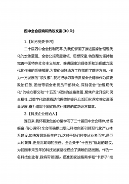 四中全会反响和热议文案(30条)1.【地方党委书记】二十届四中全会胜利闭幕,为我们擘画了推进国家治理现代化的宏伟蓝图。全会公报高屋建瓴、思想深邃,特别是对坚持和完善中国特色社会主义制度、推进国家治理体系和治理能力现代化作出的系统部署,为我们做好地方工作指明了前进方向。作“”为一方发展的领头雁,我将把学习宣传贯彻全会精神作为首要政治任务,团结带领全市党员干部群众,“深刻领会治理现代”“”化的核心要义和十五五规划的战略意图,聚焦产业升级和民生福祉,以数字化改革撬动治理效能提升,以项目化落实推动高质量发展,奋力谱写中国式现代化建设的崭新地方篇章。2.【科技企业创始人】连日来,我怀着激动的心情学习了二...
