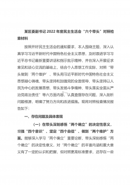某消防总队纪委书记2022年度民主生活会对照检查材料(六个带头)根据**党委关于做好2022年度民主生活会通知要求,本人对照此次民主生活会主题,在认真学习的基础上,联系过去一年来的工作实践,围绕“六个带头”进行党性分析、查摆反思,感到自身仍存在一些差距不足。现检视剖析如下,请同志们批评帮助。一、个人查摆出的问题(一)带头深刻领悟“两个确立”的决定性意义,增强“四个意识”、坚定“四个自信”、做到“两个维护”方面。作为一名受党教育多年的党员领导干部,我始终与党同心同德、同向同行,坚决做到“两个维护”,但把“两个确立”真正转化为思想自觉、政治自觉、行动自觉还不够,突出表现在:一是政治判断力有待提高。...