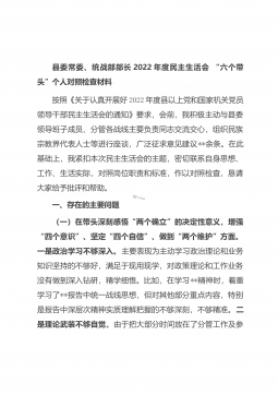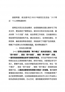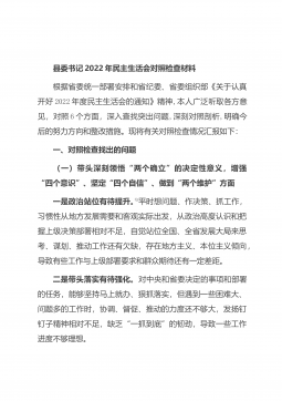 县委书记2022年民主生活会对照检查材料根据省委统一部署安排和省纪委、省委组织部《关于认真开好2022年度民主生活会的通知》精神,本人广泛听取各方意见,对照6个方面,深入查找突出问题,深刻对照剖析,明确今后的努力方向和整改措施。现将有关对照检查情况汇报如下:一、对照检查找出的问题(一)带头深刻领悟“两个确立”的决定性意义,增强“四个意识”、坚定“四个自信”、做到“两个维护”方面一是政治站位有待提升。平时想问题、作决策、抓工作,习惯性从地方发展需要和客观实际出发,从政治高度认识和把握上级决策部署相对不足,自觉站位全国、全省发展大局来思考、谋划、推动工作还有欠缺,存在地方主义、本位主义倾向,导致有...
